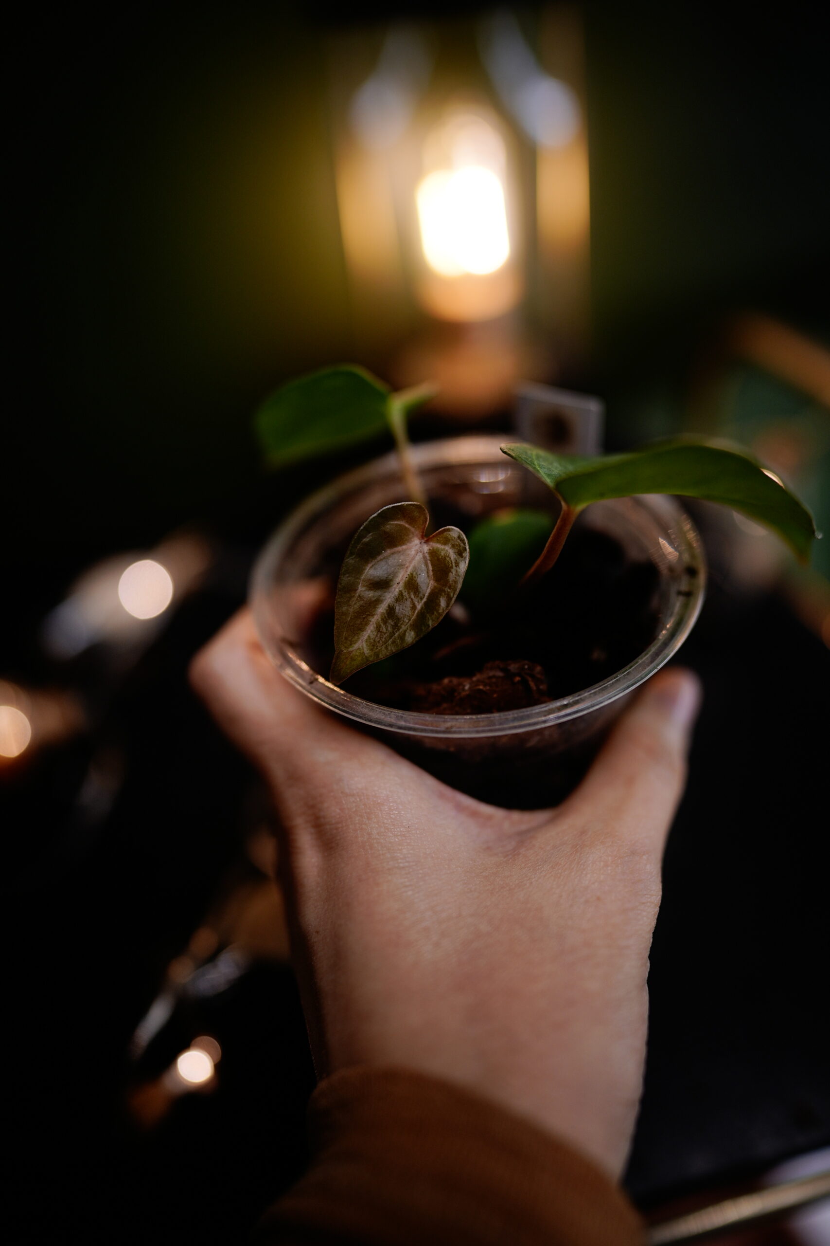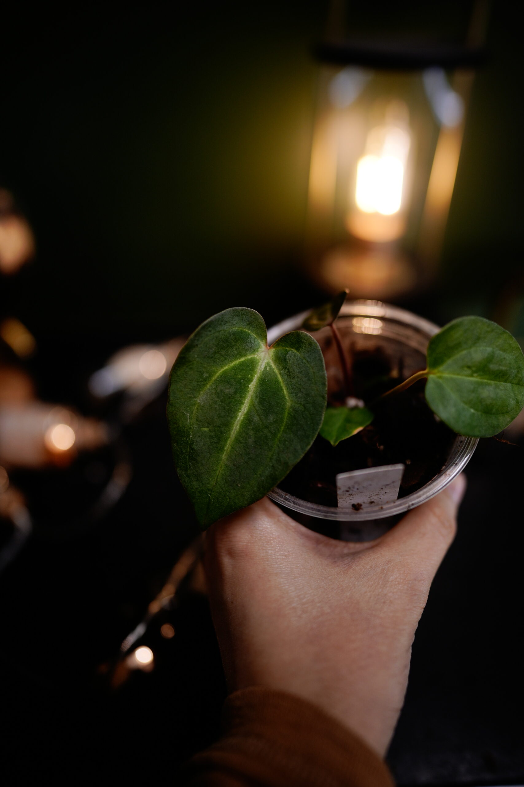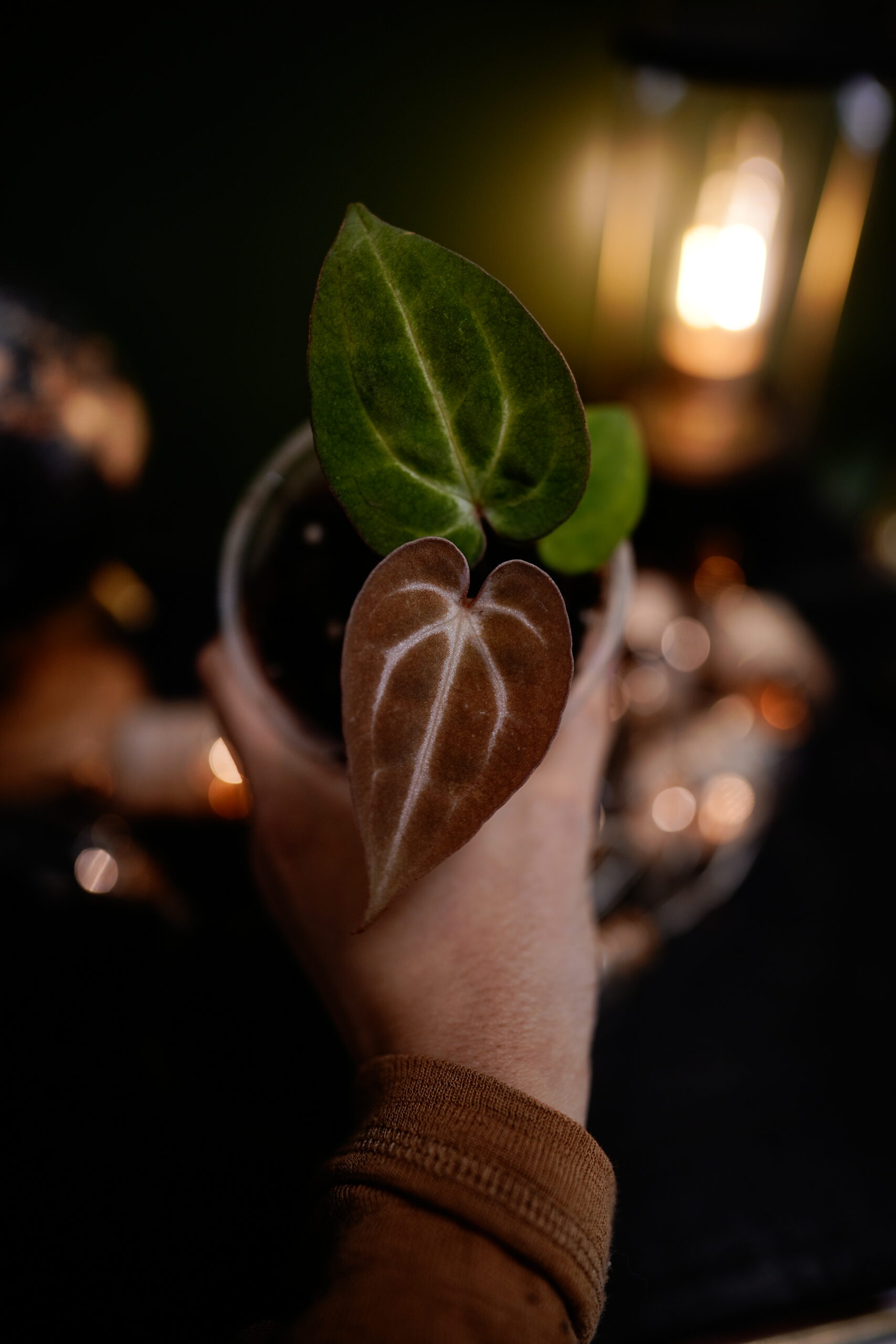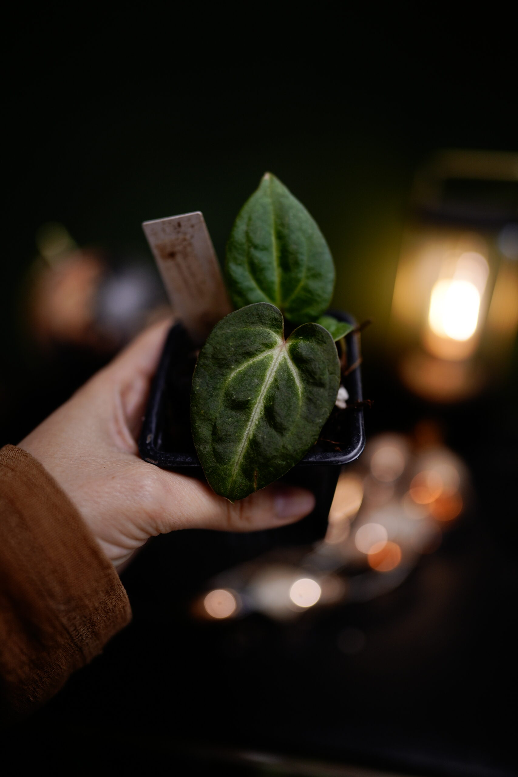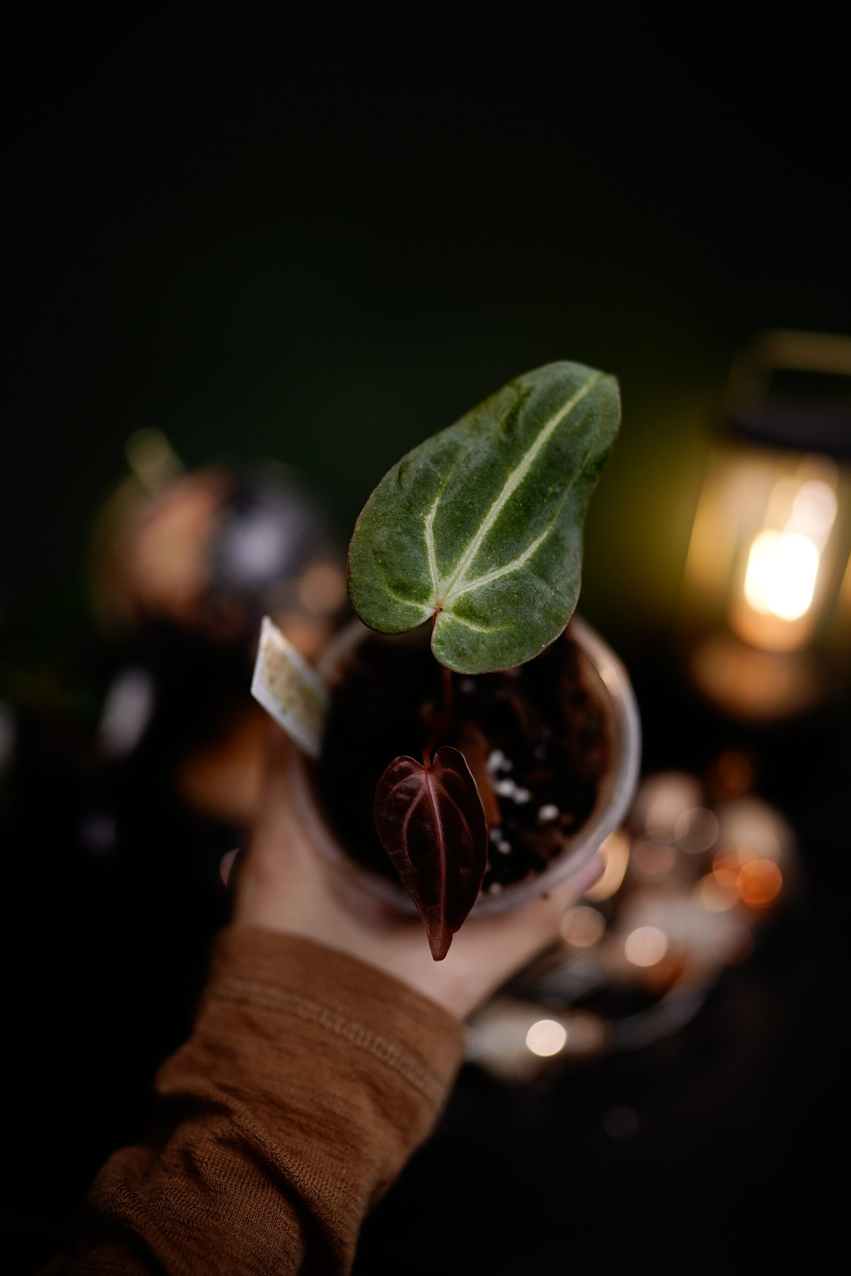 Un Anthurium Carlablackiae C1 (self), descendant direct (auto-polinisation) de ma plante mère Carlablackiae C1, connue pour son feuillage noir profond et velouté parcouru de nervures blanches spectaculaires.