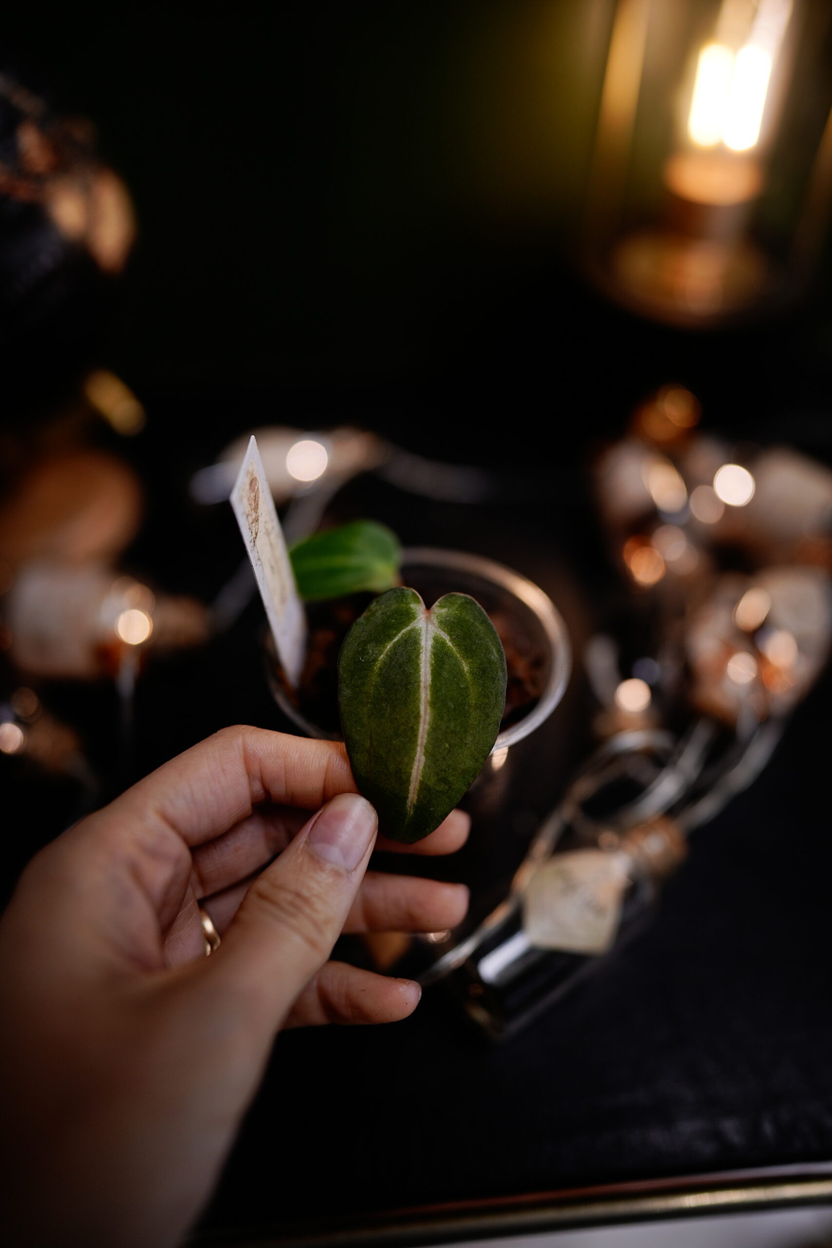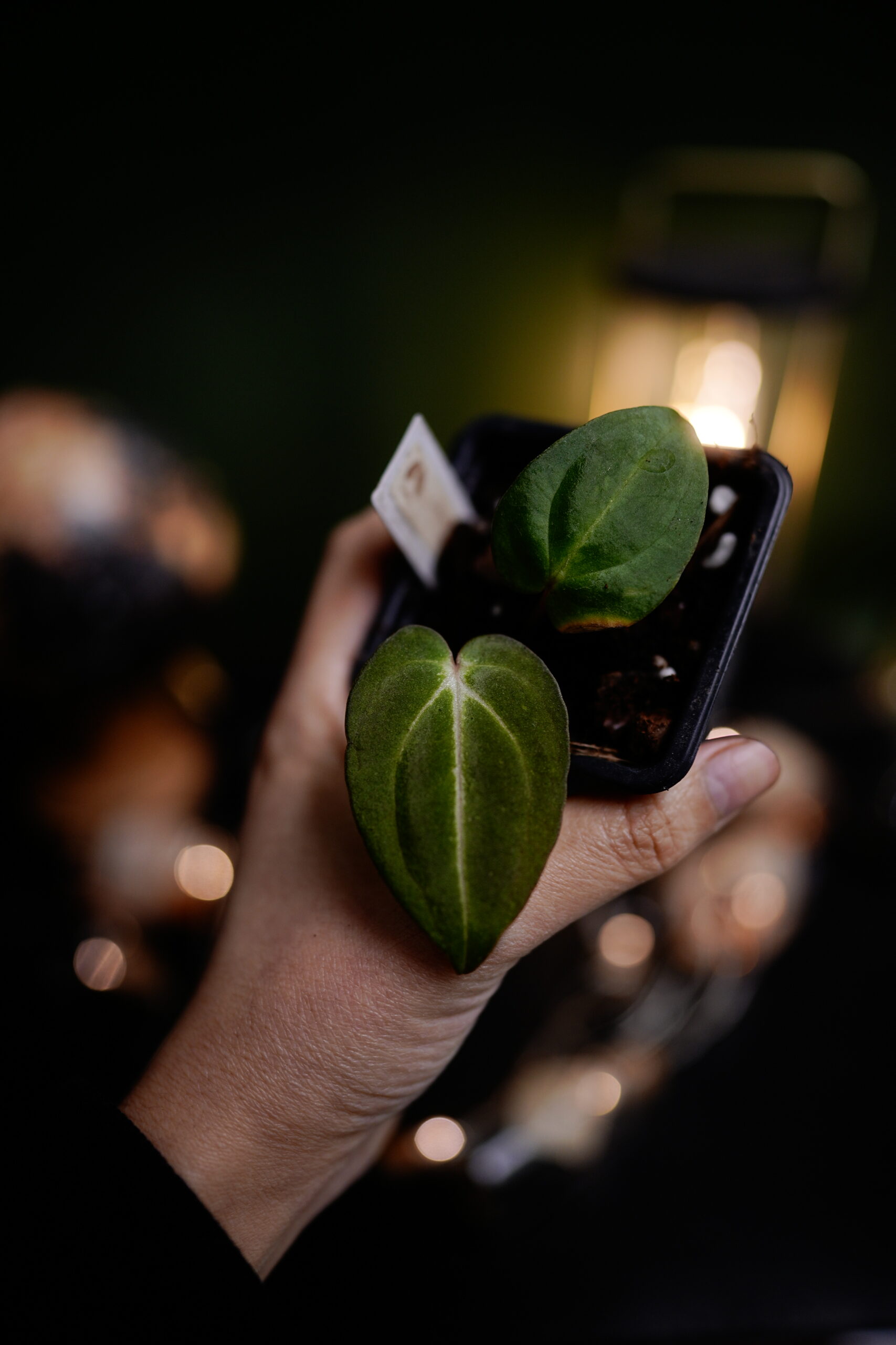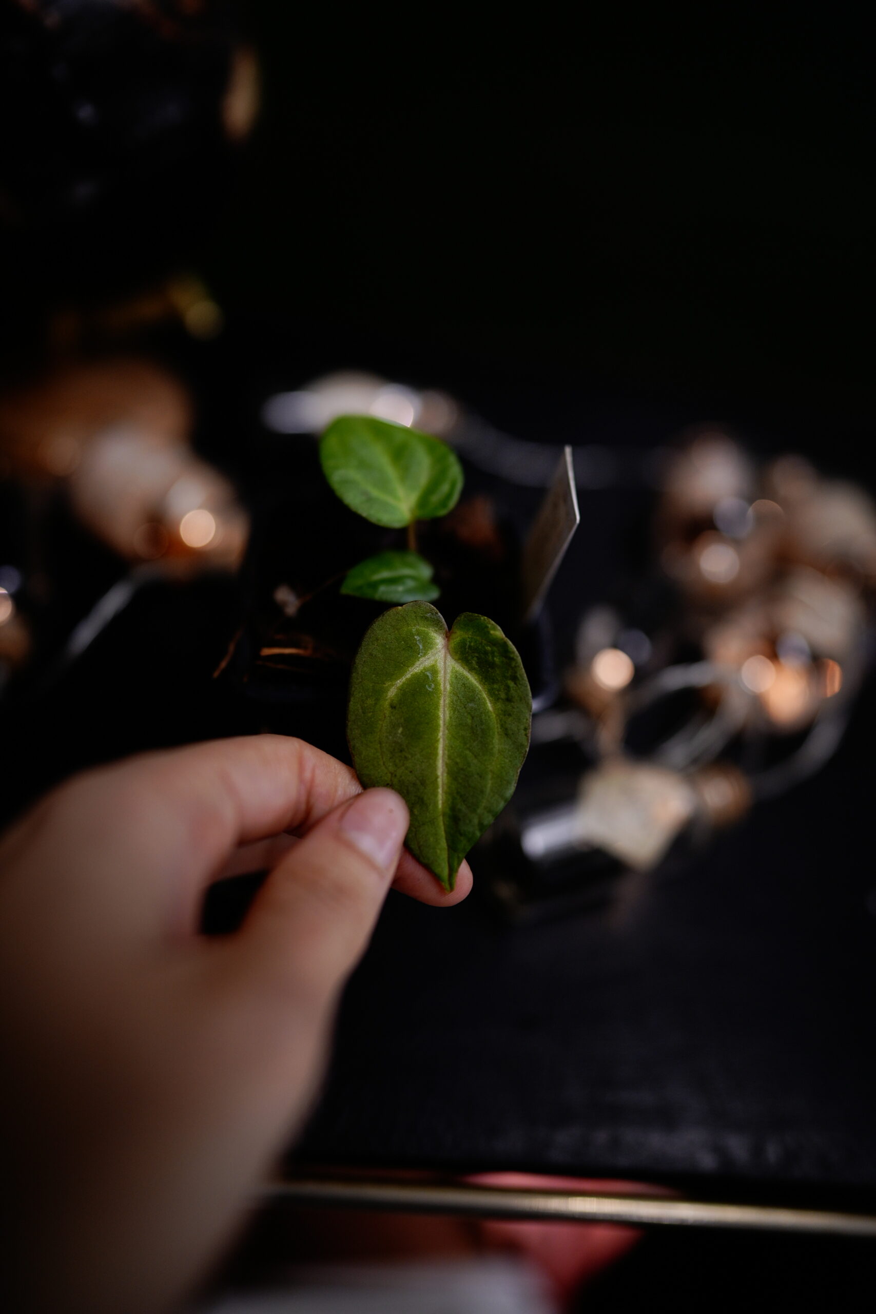 Un Anthurium Carlablackiae C1 (self), descendant direct (auto-polinisation) de ma plante mère Carlablackiae C1, connue pour son feuillage noir profond et velouté parcouru de nervures blanches spectaculaires.